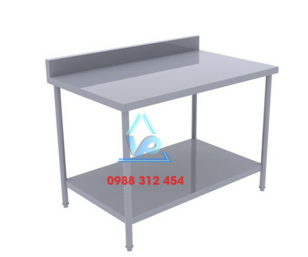 - Với công nghệ hiện đại, cùng với tính ứng dụng đa năng hơn vì nhờ gắn thêm phần gáy phía sau, giúp bàn có thể đặt ở vị trí sát tường giúp ngăn cách giữa vách tường khu bếp với thực phẩm đặt trên bàn đảm bảo vệ sinh an toàn thực phẩm hơn, và các thiết bị đặt ở bàn không bị rơi ra khi có chấn động,... Bàn inox 2 tầng có gáy thường được dùng làm bàn trung gian để gia vị, sơ chế rau, củ quả, bàn để thức ăn để bát đĩa.