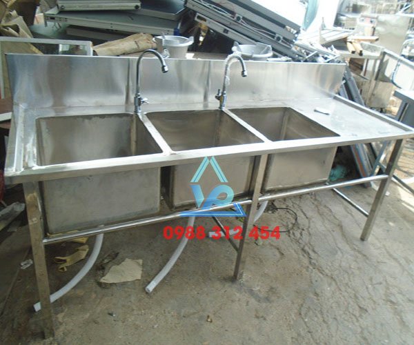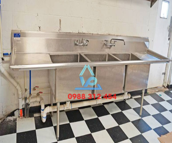 - Là một trong những sản phẩm nổi trội của dòng chậu rửa inox công nghiệp sản phẩm thiết kế chuyên nghiệp 3 hộc lớn tách riêng biệt có thể dùng làm nhiều việc tùy theo sự tận dụng khác nhau của từng khách hàng, bên cạnh đó còn có cặp cánh dài giúp quá trình làm việc thuận tiện, tiết kệm không gian hơn, thường đi kèm với các thiết bị bẫy mỡ inox, bàn inox công nghiệp, kệ inox công nghiệp trong các khu sơ chế của khu bếp.